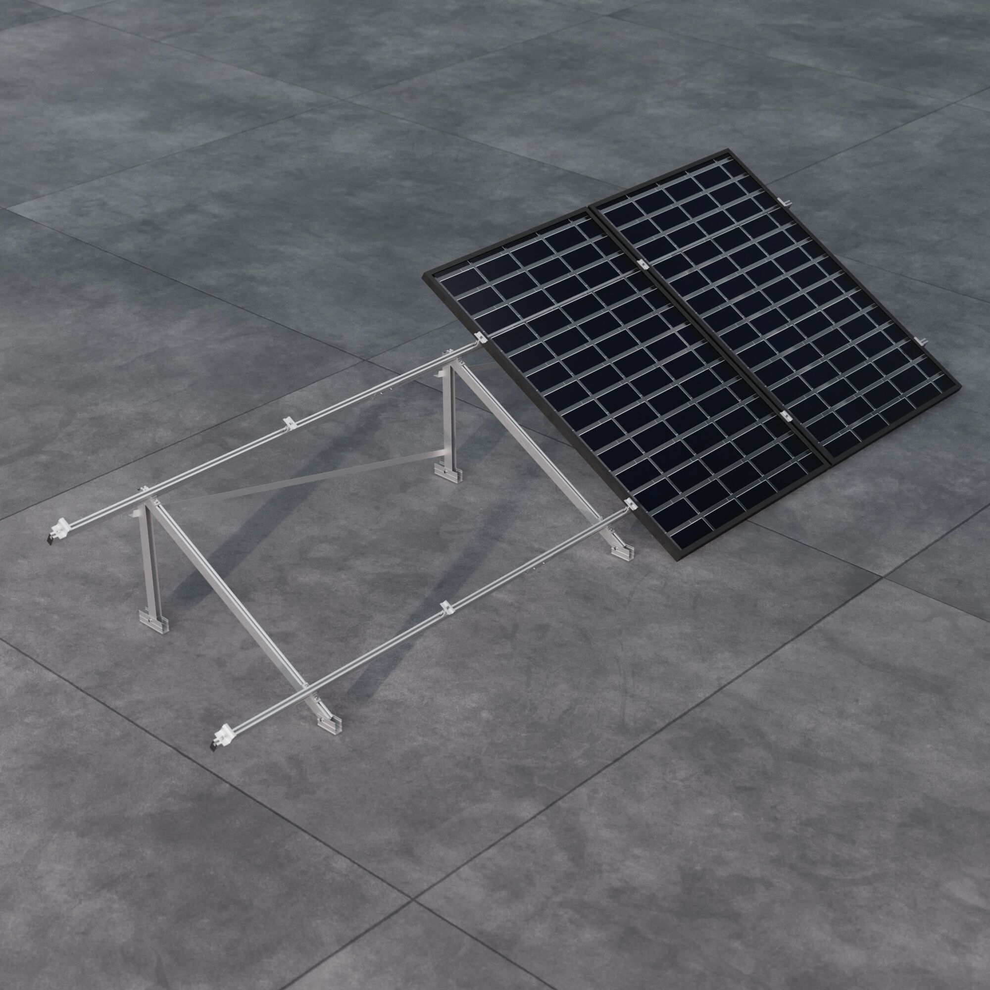 El sistema 08V de Sunfer es un soporte inclinado abierto diseñado para la instalación de paneles solares en cubiertas planas. Su estructura preensamblada tipo triángulo permite una fijación segura y eficiente en disposición vertical, con una inclinación ajustable de 15º a 30º, optimizando la captación solar.